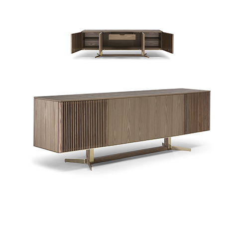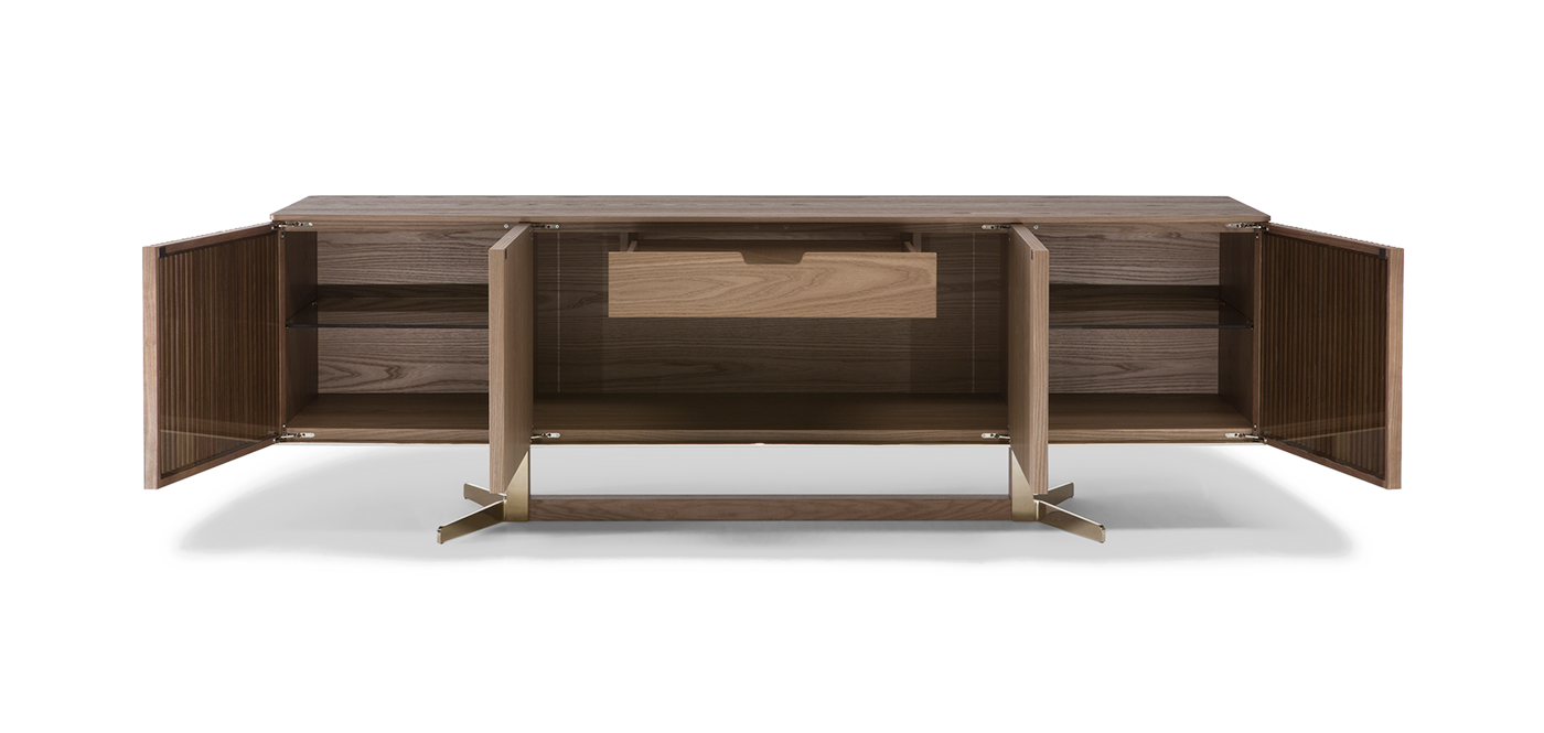 A harmonious blend of different styles characterises the Campus sideboard. The graphic linearity of back-lit doors is combined with the round volumes of the container, rounded corners and slender legs, creating an elegant mélange of solid wood juxtaposed with thick metal.