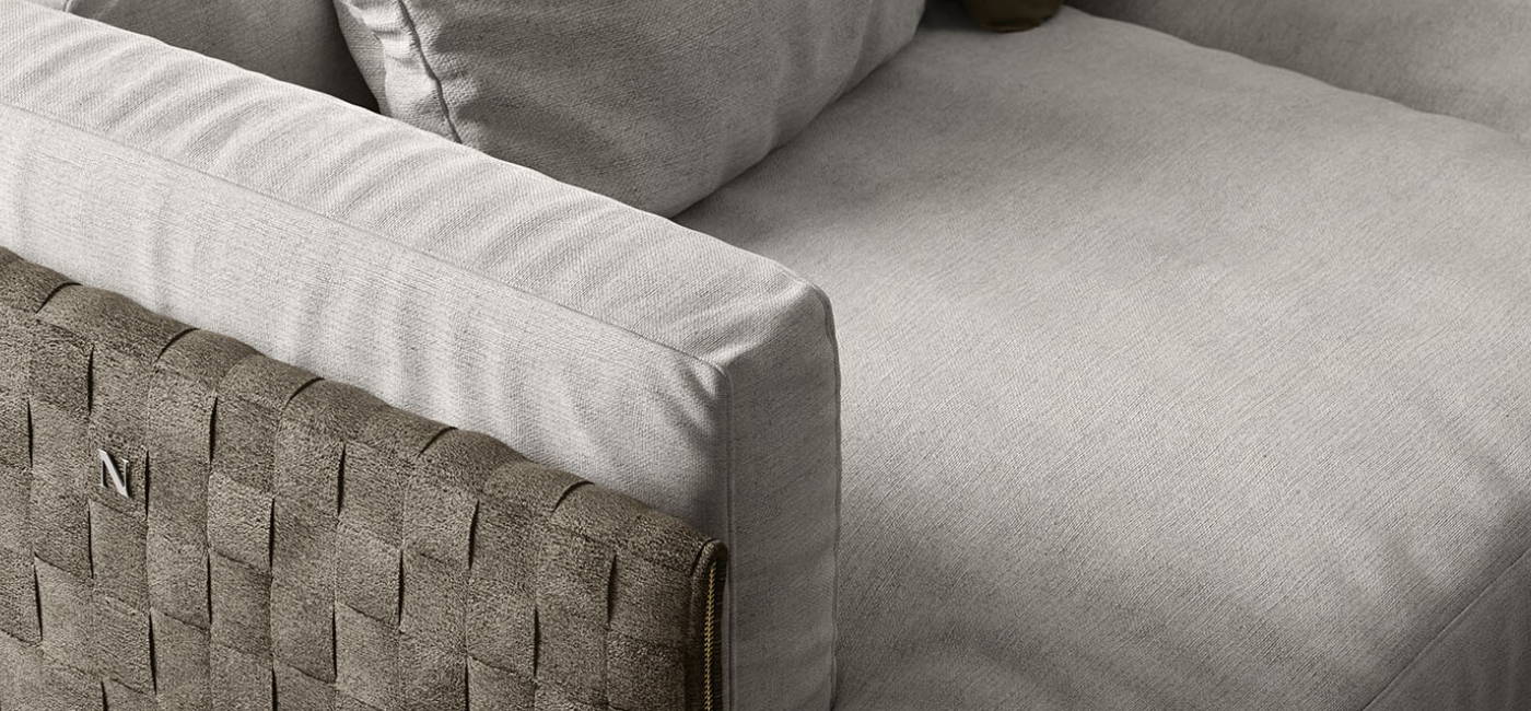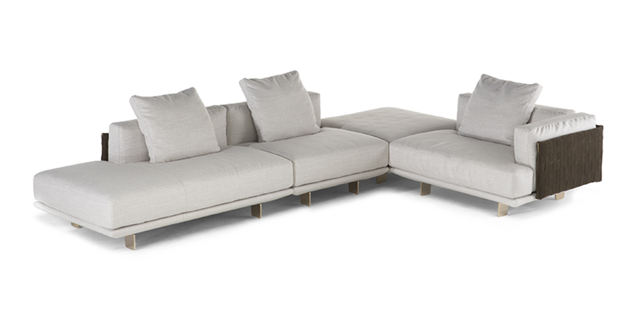 Available in removable leather and/or fabric. Unusually the frame, out of the arm and backrest, is in suede with irregular weaves available in 7 colours for a surprising mix.