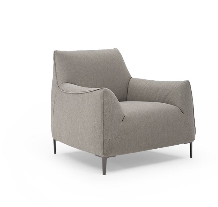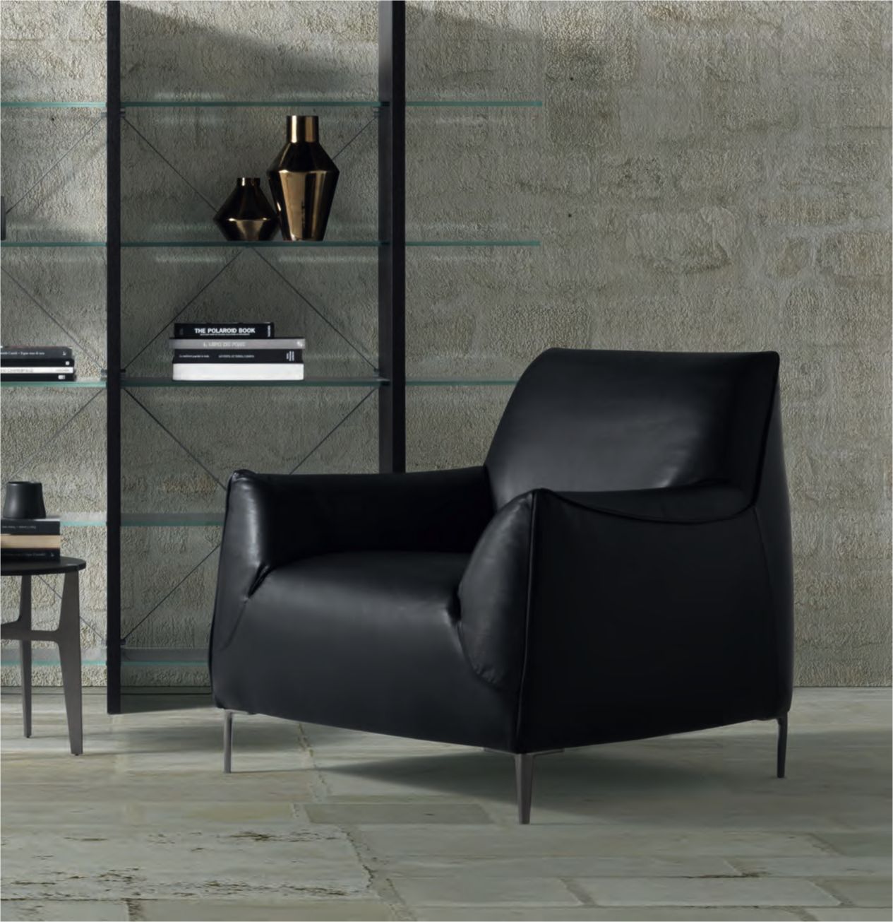 Dolly armchair features a fresh, enveloping design, providing comfort and style at the same time. The thin metal feet, available in different finishes, help create a look of elegance and lightness while supporting the generous seat, with distinctive outward curved armrests.
