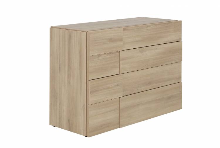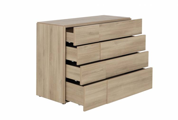 Frame and fronts in Smoked Oak or Country Oak effect foiled particleboard. Edges: 2mm thick flat ABS; Smoked Oak or Country Oak, and end-grain effect. Furniture tops with varnish finish. Clear silver glass on mirror. Drawer carcasses in Smoked Oak or Country Oak effect foiled fibreboard mounted on invisible, height adjustable runners, with soft close mechanisms on bedside drawer unit, tall chest and chest of drawers.