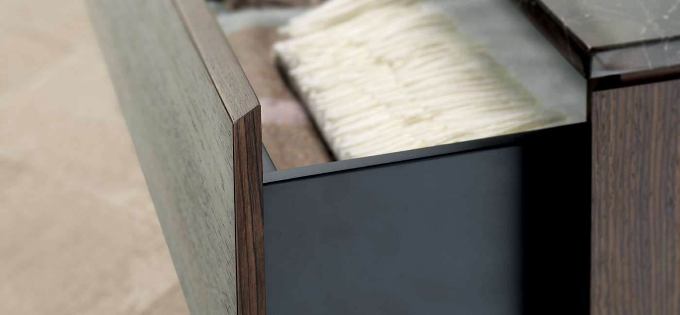 The Munari collection is characterized by a rich three-dimensional design. Each element is elegantly finished on the outside and inside with matching finishes. All complements are equipped with a soft closing system to prevent slamming.