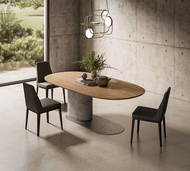 The new Ombra dining table is a characterized by a refined sculptural design whereby natural and industrial materials have produced a project with minimal aesthetics and a strong identity.