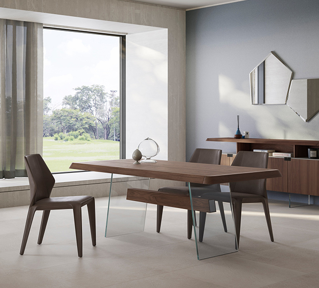 The elegant Phantom table, is characterised by a light, floating design: the majesty of the wood and the lightness of the glass base make the design of this table unique and highly distinctive. Two extra-clear glass plates support the table top, which seems to be suspended in the air.