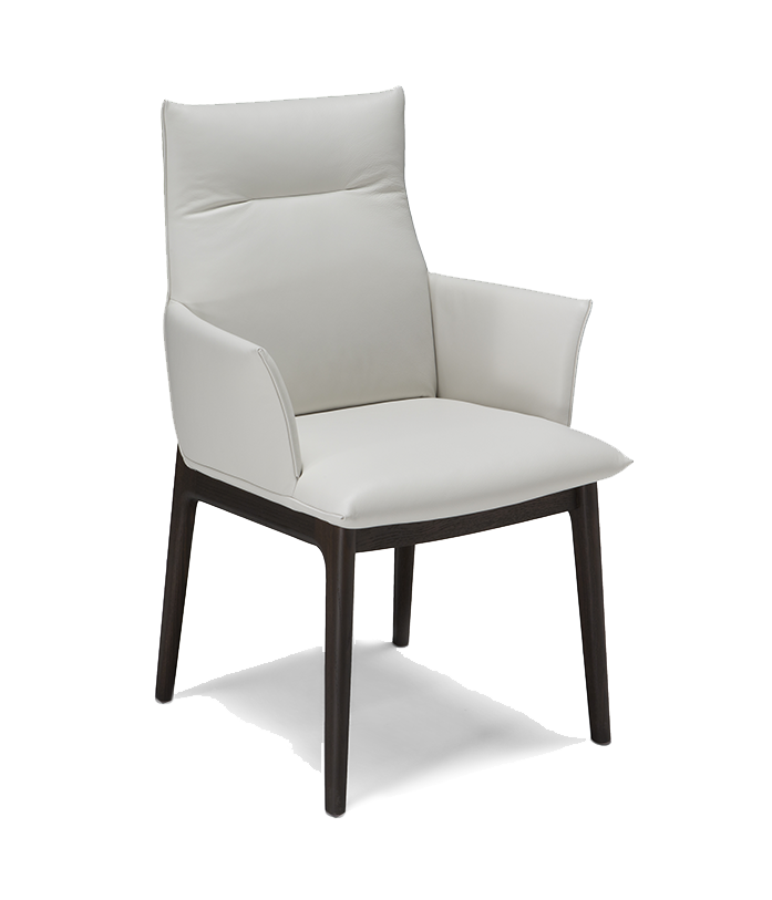 Seat part and back rest with metal structure, padded with polyurethane foam in varying densities and covered with leather. Chair fitted with one-way elastic straps, whose high resistance guarantees optimum support over time and exceptional comfort.  Base in solid walnut and/or oak.